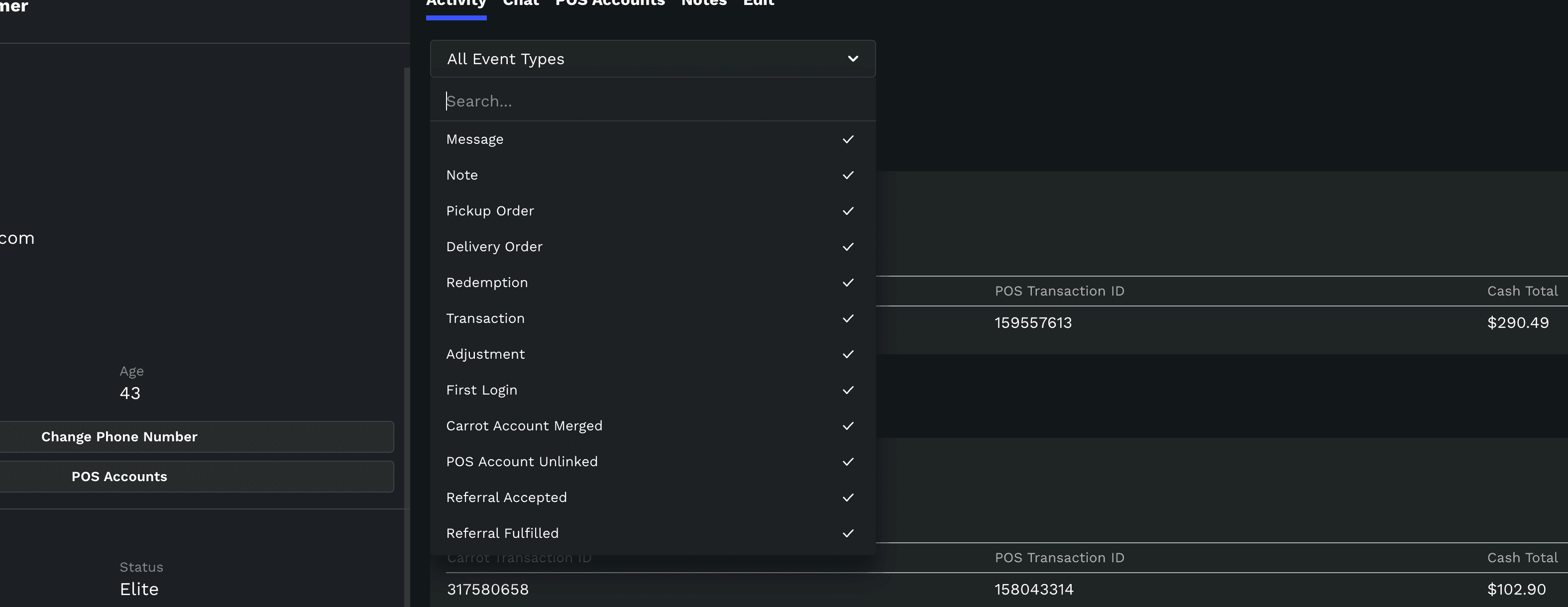 You can now easily filter the customer activity page in the Admin App based on desired event types, such as displaying only Carrot orders or redemptions.